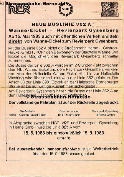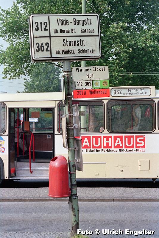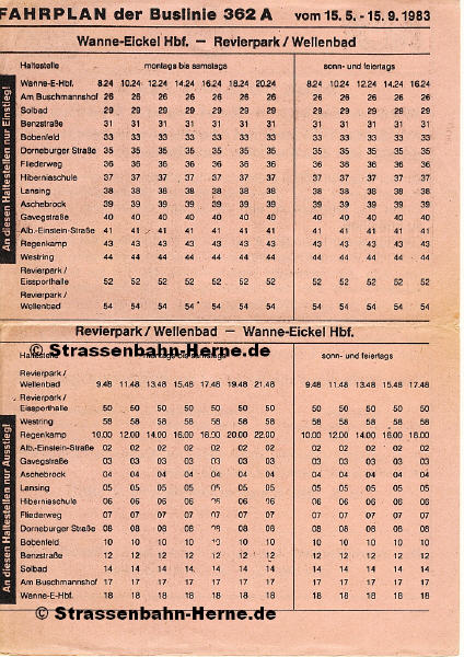 Das A hinter einer Liniennummer hat Tradition, wenn es darum geht, Besonderheiten für einen Linienweg herauszustellen. Das Bild verrät es schon, die Linie 362 erhält das A für das Teilstück Herne Bf - Revierpark Gysenberg. Damit es auch jeder merkt, werden die Fahrzeuge und Haltestellen entsprechend farbig rot ausgestattet. Das Spektakel endete nach dem Probebetrieb am 15.09.1983, mangels Nachfrage.