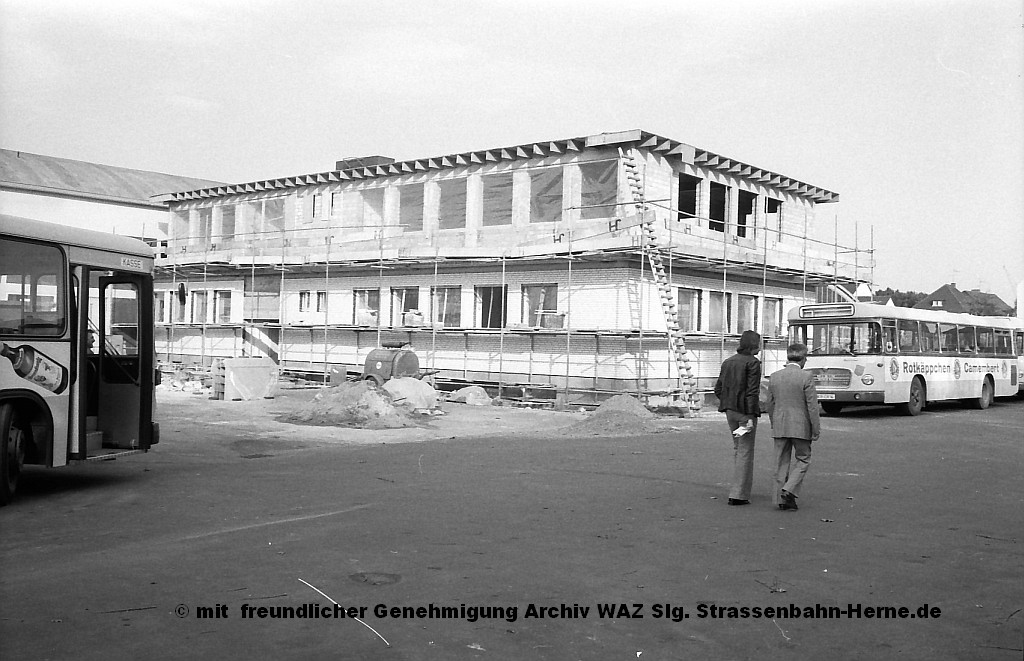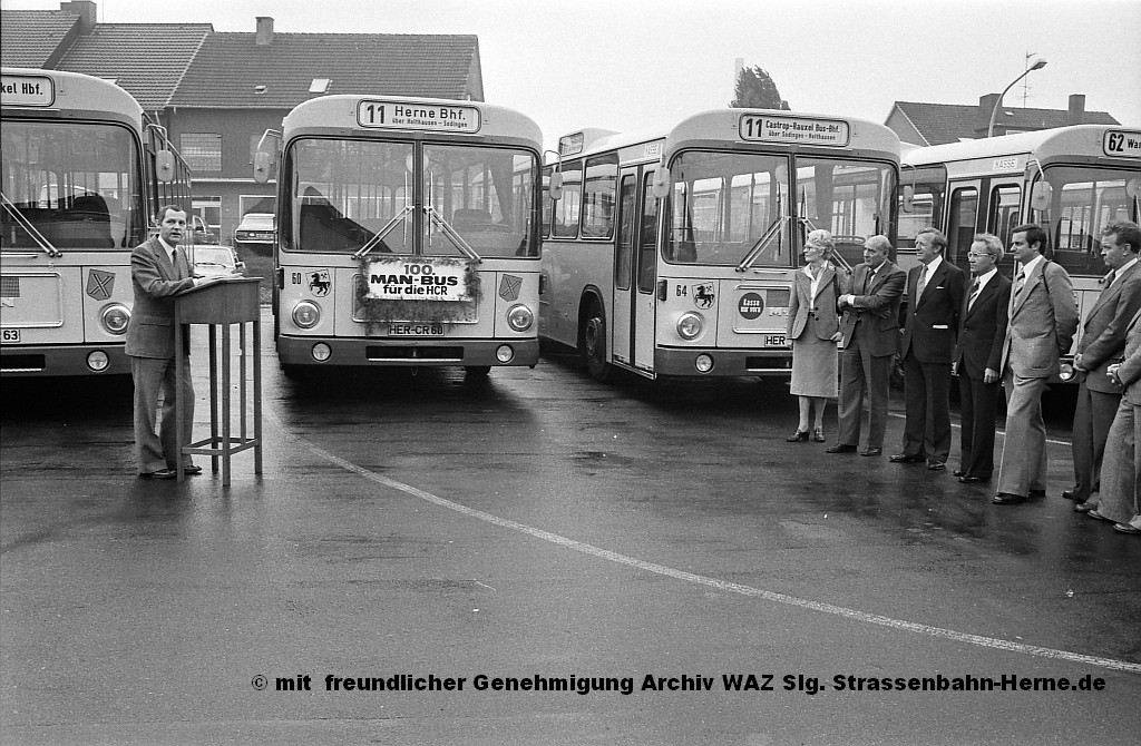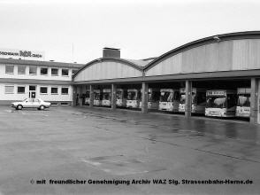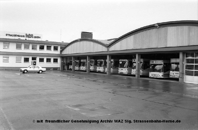 1949 war ein einschneidendes Jahr für die HCR. Von der Vestischen Strassenbahn wurde ein gebrauchter Bus übernommen. Von Bus in dem heutigen Sinne kann allerdings nicht die Rede sein. Wie in verschiedenen Ländern der Welt heute auch noch üblich, war dies ein LKW-Fahrgestell mit einem Aufbau für den Personenverkehr. Damit wurde die erste Buslinie von Baukau nach Herne-Süd eingerichtet. Während die ersten "richtigen" Busse (anfangs noch mit Anhänger) von Krauss-Maffei kamen, wurde schnell die Maschinenfabrik Augsburg/Nürnberg - besser bekannt unter dem Namen MAN - Hauslieferant. Bis auf wenige Ausnahmen (je einem Fahrzeug von Magirus, Mercedes-Benz und NWF) wurden verschiedene Modelle von MAN bestellt. So wurde aus dem MAN SL 200 Wagen 60 im Jahr 1978 bereits der 100. MAN, 1987 mit dem MAN SL 202 Wagen 31 schon der 150. Bus aus gleichem Haus. Über die Jahrzehnte hinweg vergrößerte sich das Liniennetz durch Übernahme von Linien der BOGESTRA und Vestischen, mehr eigene Fahrzeuge und Personal waren auch der Grund für den Betriebshofwechsel im Jahr 1960 auf das heutige Grundstück.