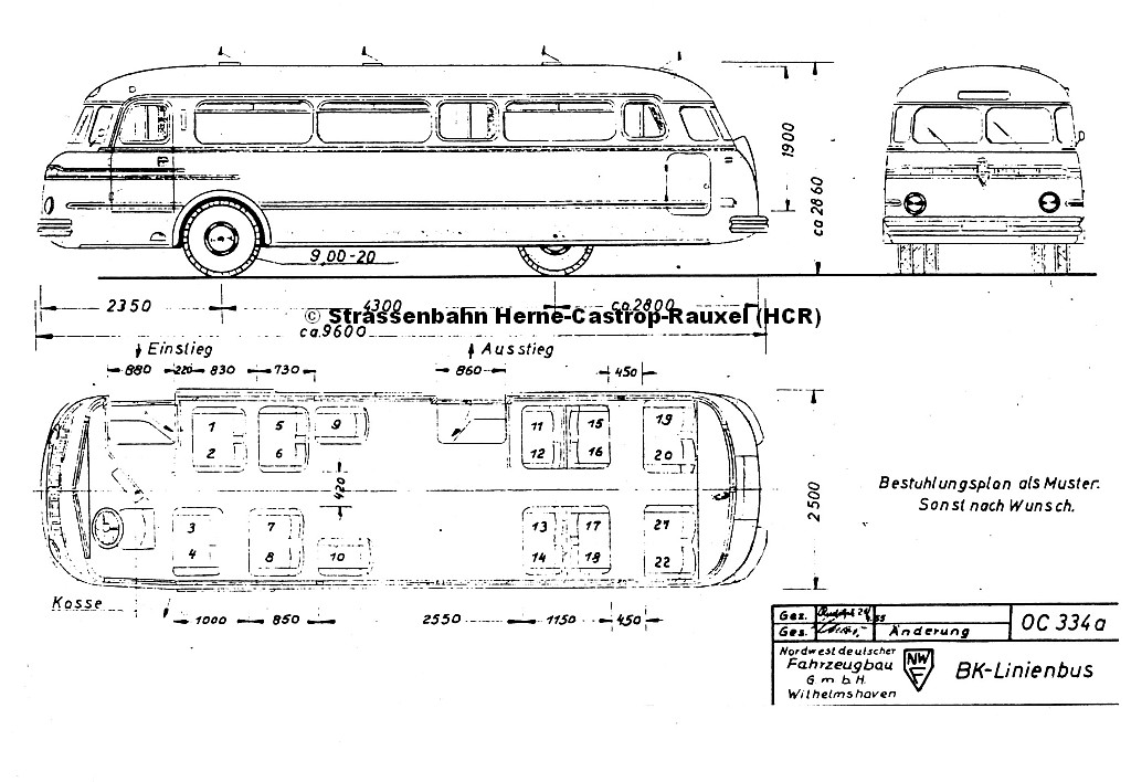 Im April 1955 mussten die NWF Konkurs anmelden, nachdem sich kurz vorher der Konkurrent Krauss-Maffei von seiner Beteiligung bei NWF zurückgezogen hatte. Aus dieser Konkursmasse wurde der BK 4, der aufgrund seiner 33 Plätze auch unter der Bezeichnung "Bus klein 334" lief, gebraucht von der HCR übernommen. Im Jahr 1961 verunfallt Wagen 164 und muss aufgrund der schweren Schäden ausgemustert werden. Auch er konnte die Erwartungen an einen damaligen Bus nicht erfüllen. Den Beinamen "Pleitegeier" bekam er aber nicht wegen seiner zahlreichen Ausfälle aufgrund technischer Mängel, sondern eben wegen des Aufkaufes aus der Konkursmasse. Zu der Nordwestdeutschen Fahrzeugbau (NWF), auch gerne Nordwestdeutsche Fahrzeugwerke genannt, können Sie hier noch weitere Informationen erhalten.
